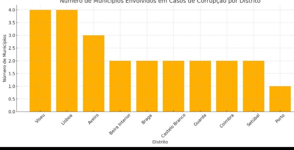 O gráfico abaixo mostra a distribuição dos casos por distrito, com base no número de municípios visados por investigações de corrupção autárquica: