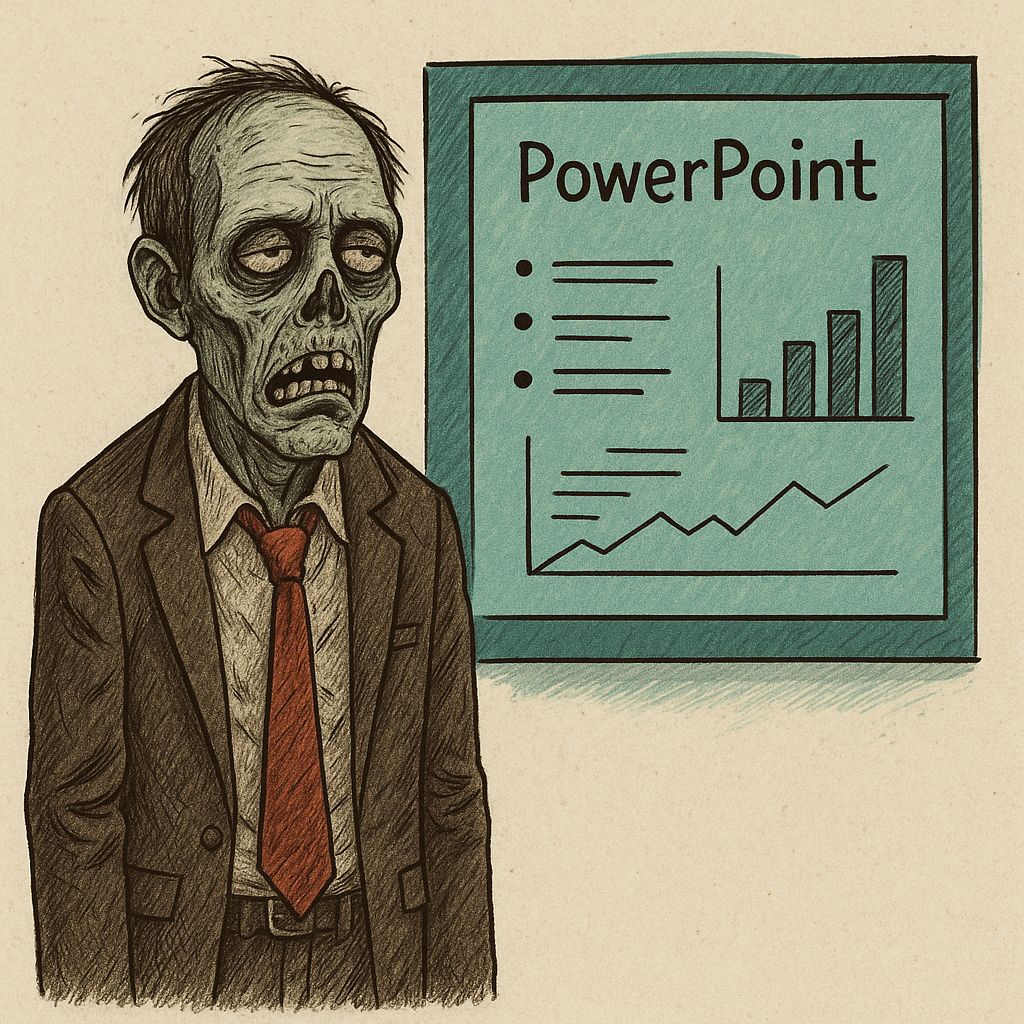 Numa época que clama por clareza, síntese e ação, o Zombi do PowerPoint continua a arrastar os seus ficheiros entre departamentos — como um pen-drive encantado pela sombra da irrelevância.