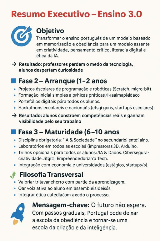 👉 Mensagem-chave: O futuro não espera. Com passos graduais, Portugal pode deixar a escola da obediência e tornar-se uma escola da criação e da inteligência.
