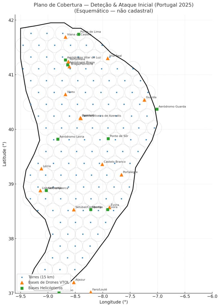 Segue um mapa de Portugal com a rede ideal de torres, bases de drones e zonas de cobertura satelital, mostrando como cobrir 100% do território sem falhas — isso deixaria o plano visualmente claro e quase impossível de refutar perante qualquer ministro.