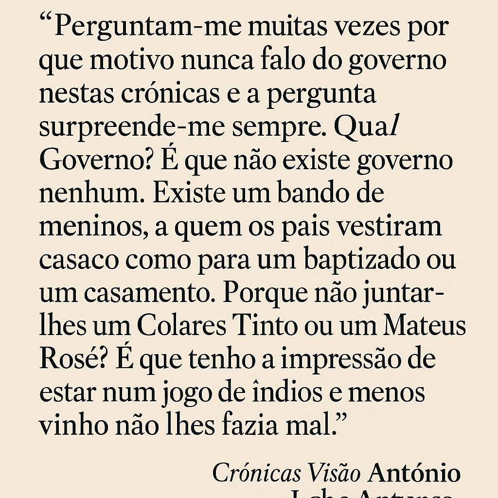 Em vez de ministros, parecem rótulos de garrafas: um Aguiar Branco, um Poiares Maduro… porque não juntar um Colares Tinto ou um Mateus Rosé? Ao menos seria mais honesto: o país está transformado numa carta de vinhos mal arrumada, onde a escolha nunca sacia e apenas embriaga.
