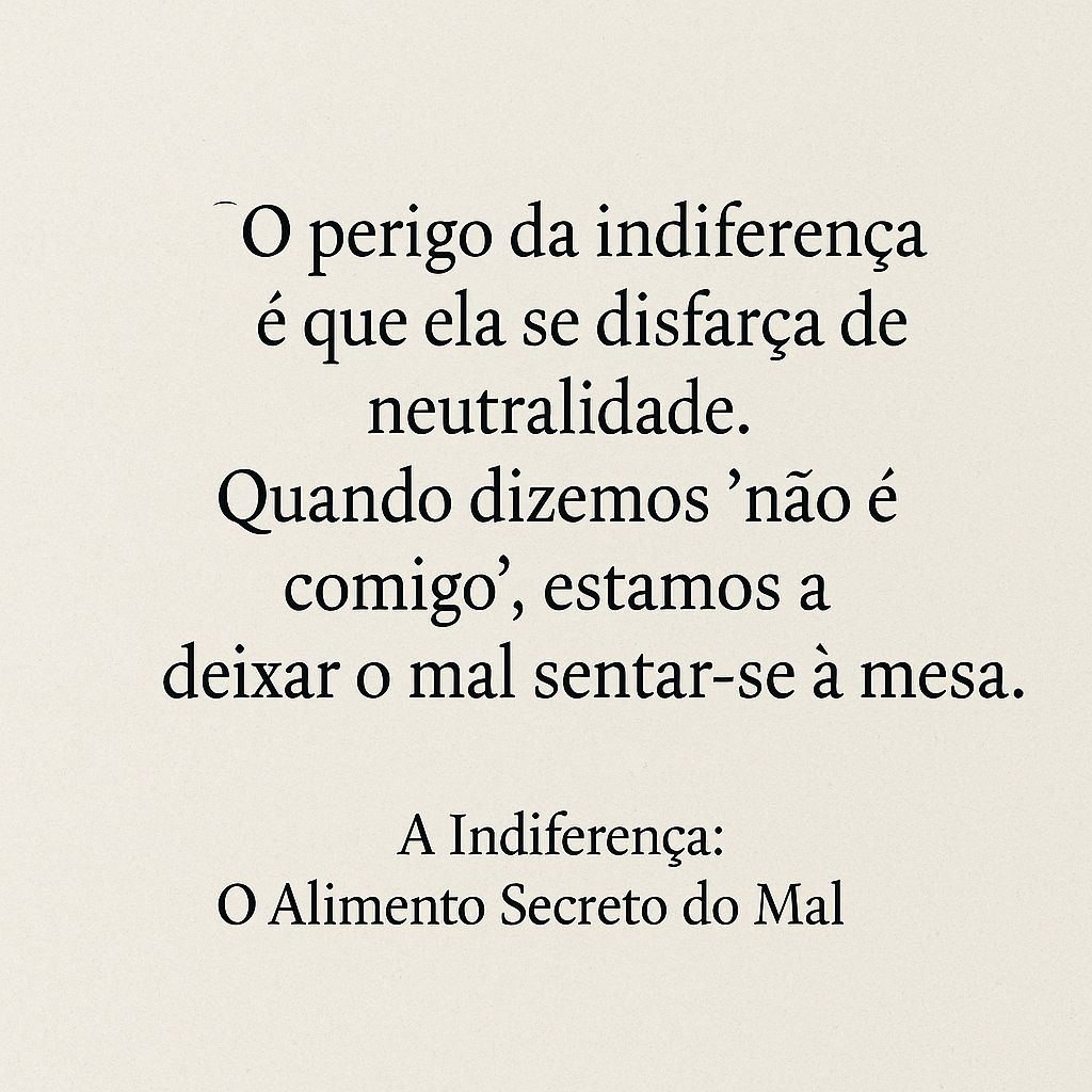 O perigo da indiferença é que ela se disfarça de neutralidade. Quantas vezes ouvimos dizer: "não é comigo", "não quero problemas", "a política não me interessa"? Mas é precisamente nesses intervalos de silêncio que o mal encontra espaço para crescer, infiltrar-se e consolidar-se.