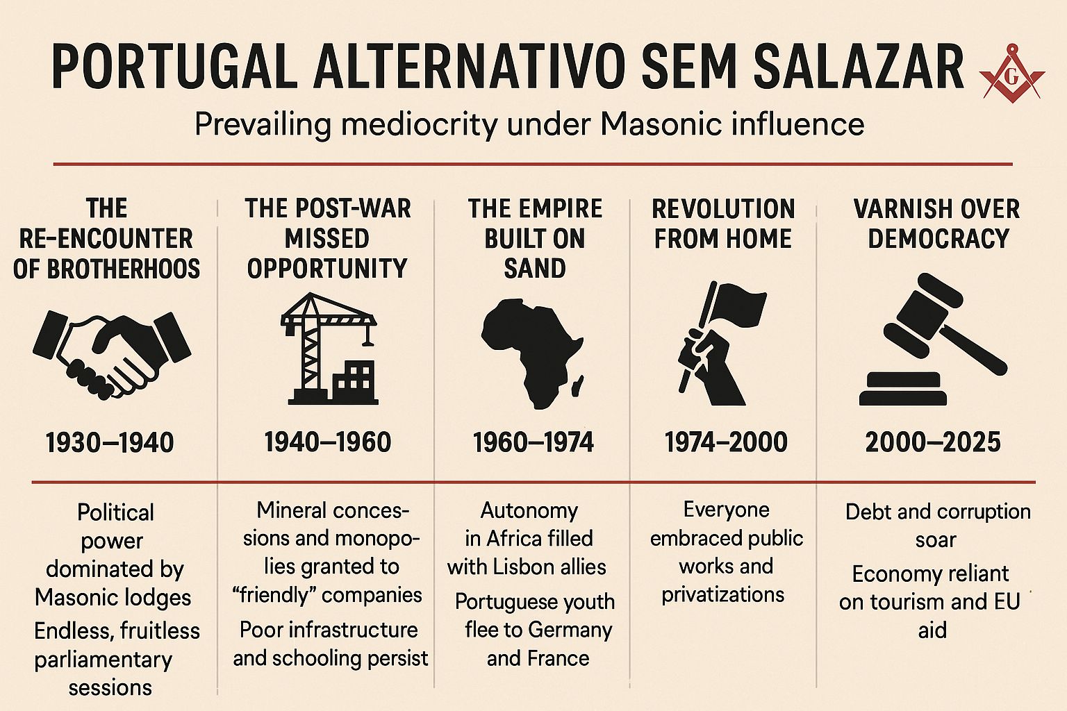 Vamos então imaginar um cenário alternativo, — uma espécie de "ficção histórica lúcida" sobre o que poderia ter acontecido, se Salazar não se tivesse eternizado no poder e se a maçonaria e outras forças subterrâneas [ que estiveram na clandestinidade na ditadura de Salazar], tivessem emergido mais cedo. Como estaria Portugal hoje, melhor, pior ou na "mesmice". Este é apenas um exercício de cidadania, baseado em factos históricos, sabendo-se que as organizações maçónicas e outra organização terrivelmente violenta, a Carbonaria, foram as responsáveis pela queda da monarquia e a instauração da I República. A Carbonaria acabaria extinta no inicio da República e muitos dos seus membros terão ingressarado na Maçonaria. Como é bem do conhecimento público a I República foi um desastre governativo, com governos a cair todos os meses, atentados, violência sem fim e divida pública da nação a crescer astronómicamente, como documenta a linha do tempo que se segue :