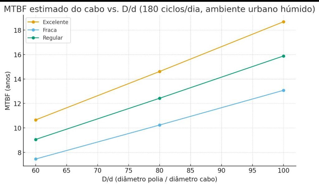 💡 Traduzindo: se o Elevador da Glória fizesse, por exemplo, 200 viagens/dia, isso dá ~73.000 ciclos/ano. Um cabo certificado pode aguentar ~1 milhão de ciclos → MTBF ≈ 13–15 anos em condições ideais. Mas… Lisboa não é laboratório. Com oxidação e manutenção "à portuguesa", o cabo pode ser trocado a cada 5–7 anos para não arriscar.