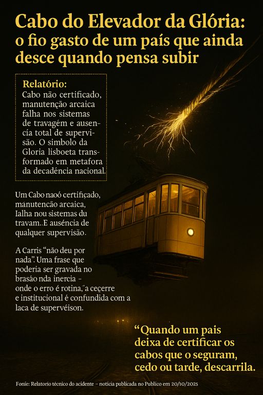 O Elevador da Glória é, afinal, a imagem perfeita de Portugal: sobe e desce, mas nunca avança. Um país preso a um cabo gasto, sem certificado de futuro. E o que falha não é apenas a mecânica — é a consciência.