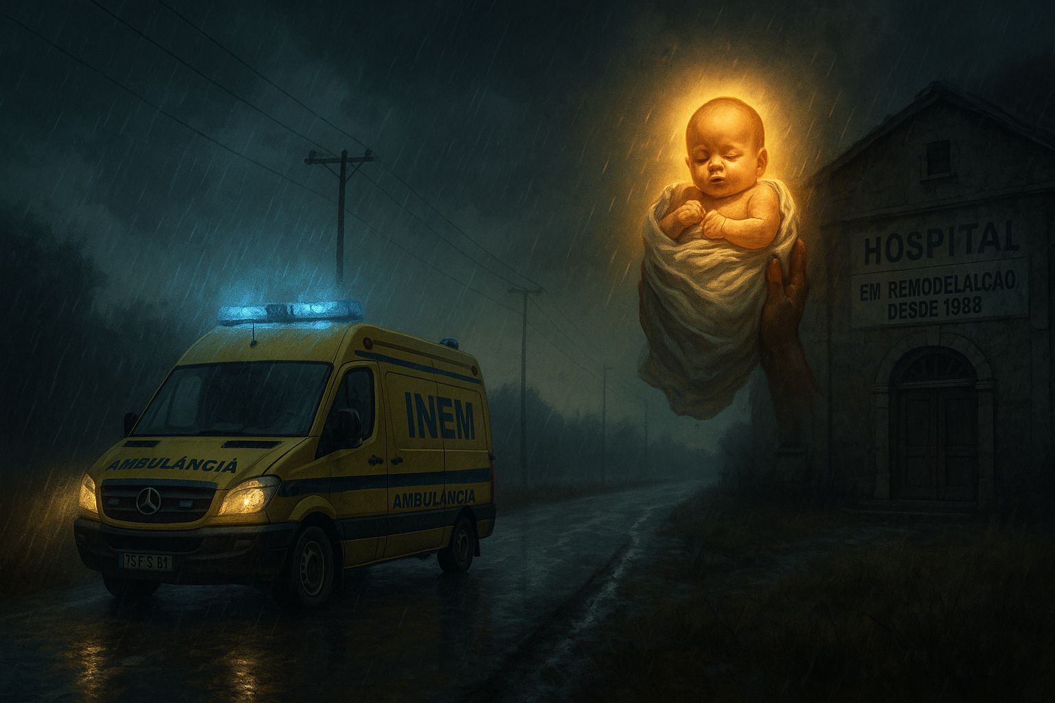 Portugal é o único país onde a maternidade pode ser móvel, com vista panorâmica e travagem ABS. O parto torna-se uma experiência todo-o-terreno: curvas, solavancos, uma maca, e o hino nacional a tocar no fundo. E no final, o bebé recebe o primeiro certificado de cidadania — um recibo do SNS com o selo "Transporte de Urgência".
