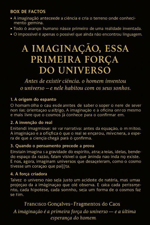 A imaginação é a gravidade do espírito: atrai ideias, dobra o espaço da razão, torna visível o que ainda não existe. É o primeiro motor imóvel de Aristóteles, reencarnado na mente humana. Com ela, o homem não se limita a observar o universo — recria-o, interpreta-o, participa do seu próprio mistério.