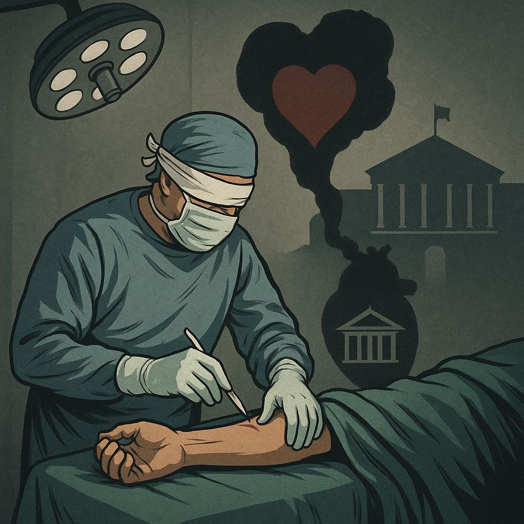 Mas há um detalhe que não passa despercebido a quem pensa dois minutos seguidos: por que razão se escolhe o SNS como palco principal desta cruzada, e não todo o aparelho do Estado? Porque é que o corte é cirúrgico e sectorial, em vez de estrutural e transversal? O bisturi foi cuidadosamente apontado a um órgão visível, mediático, politicamente "seguro" - a saúde, poupando o coração do regime, onde se acumulam as decisões de ouro: governo, parlamento, grandes contratos, parcerias público-privadas, empresas públicas e municipais.