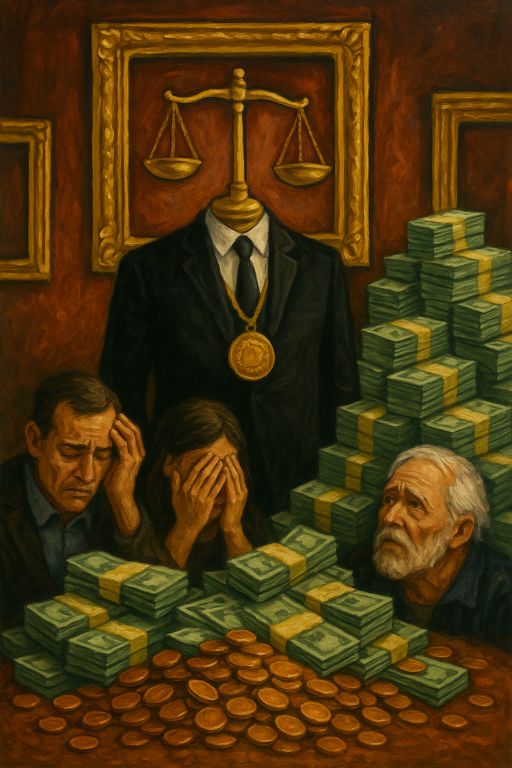 Alegoria da justiça capturada pelo dinheiro e pela mediocridade institucional.