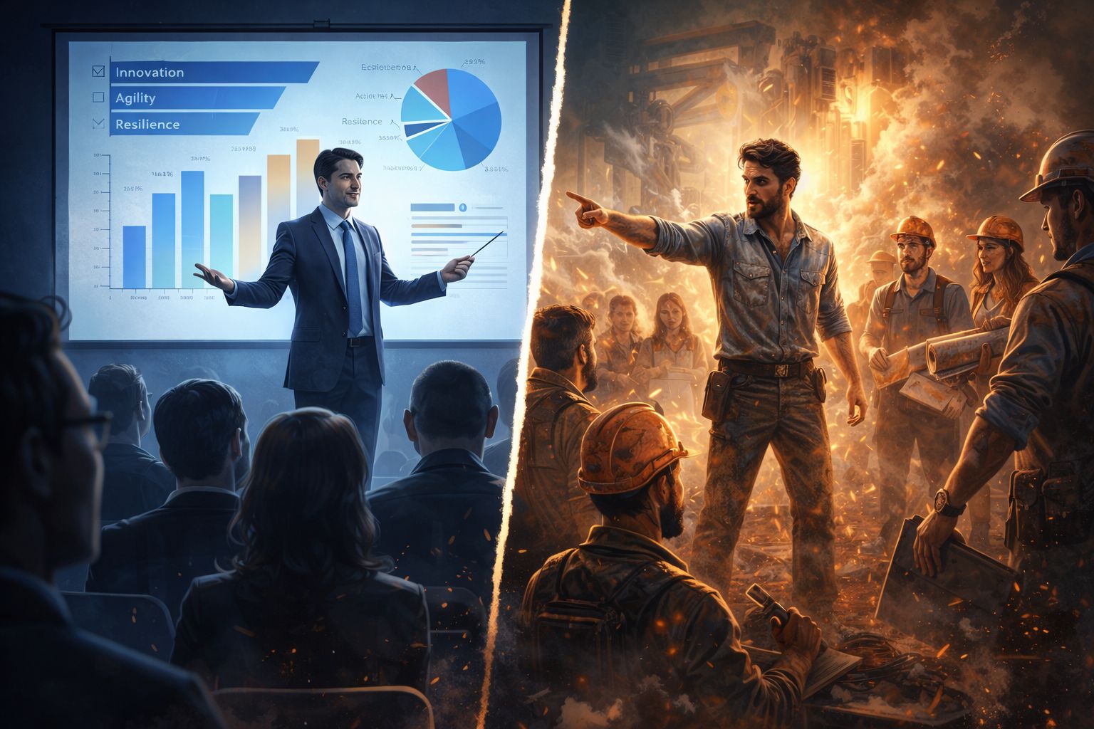 A liderança verdadeira faz o contrário: decide, mede, corrige, repete. Não encena. Não "alinha stakeholders" com jargão. Não vende nevoeiro com laser pointer.