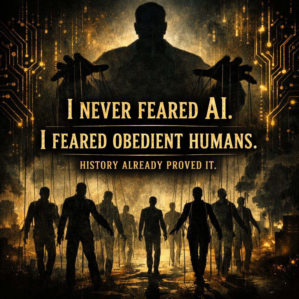 But my oldest fear is not silicon. My fear has always worn a familiar face: the obedient person. The human who salutes before thinking. The citizen who trades doubt for belonging. The neighbour who calls cowardice "discipline" and names it a virtue. A machine does not crave applause. It does not hunger for flags, crowds, chants, uniforms, or the sweet narcotic of "We are right because we are many." Humans do. And history — that brutal librarian of our sins — keeps the receipts.