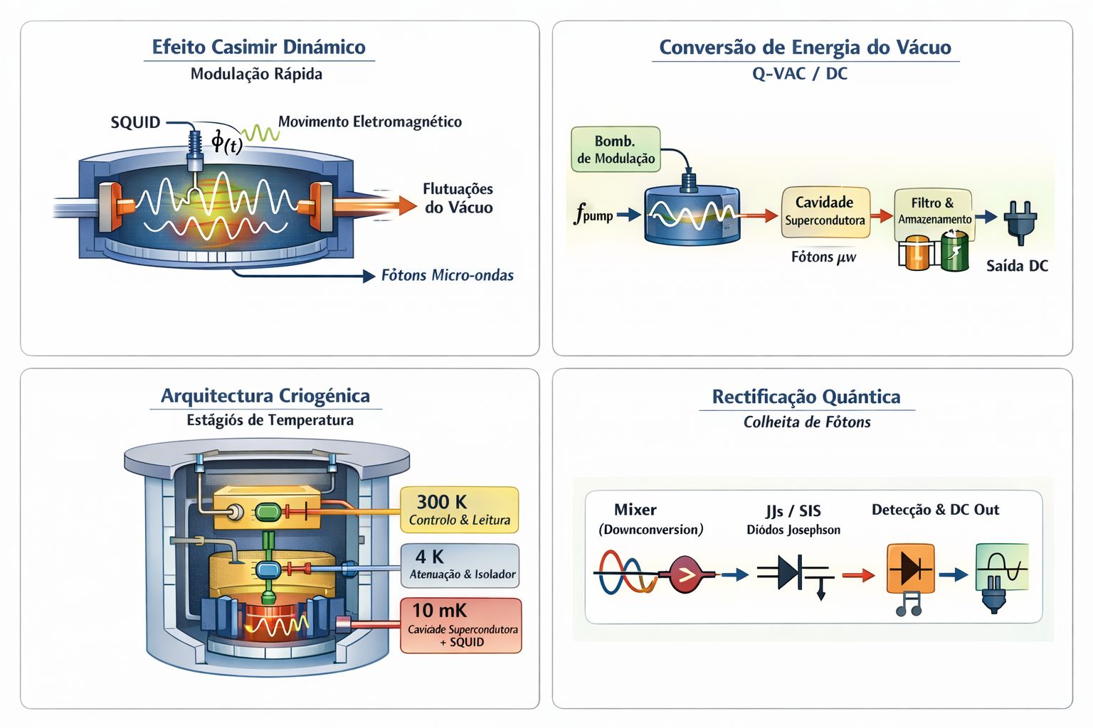 - Oportunidade real: engenharia de cavidades e circuitos supercondutores para amplificação paramétrica, metrologia extrema e sensores.