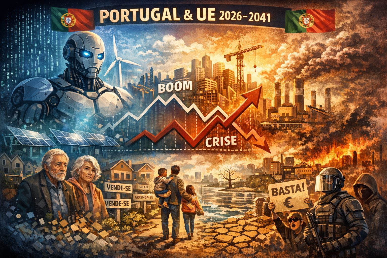 Portugal e União Europeia (2026–2041): ciclos económicos, fricção geoestratégica e tensão social na era da IA