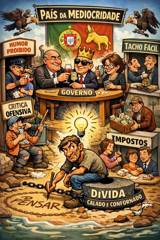 Em Portugal, não se proíbe oficialmente o pensamento — seria deselegante, coisa de regimes que usam botas. Aqui prefere-se algo mais requintado: a pedagogia do constrangimento. Não te batem: olham-te. Não te prendem: rotulam-te. Não te calam: fazem-te parecer ridículo. É assim que se constrói um país "civilizado": com vozes a pedir licença antes de falar, com gargalhadas a serem medidas ao milímetro, com humor a precisar de certificado de conformidade. O resultado é um povo que aprende a falar baixo… até começar a pensar baixo.II. Quando o humor vira crime de lesa-seriedade