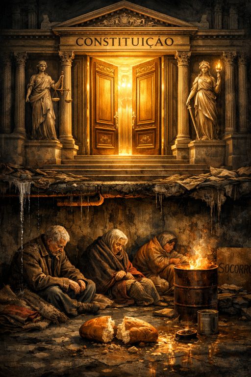 A Constituição pode ser um palácio. Pode ter colunas impecáveis, portas douradas, salas de eco onde se repetem as palavras certas: liberdade, direitos, igualdade, justiça. Mas se, no átrio desse palácio, milhões dormem ao relento — então o palácio não é casa: é vitrina.