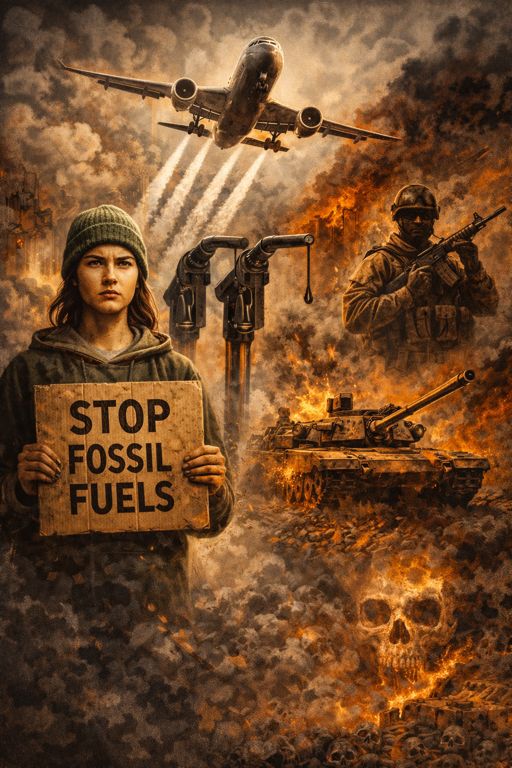 Quem quiser mesmo enfrentar a crise climática terá de olhar para cima — para os aviões — e para diante — para os campos de batalha. Terá de olhar para os porta-aviões, para os caças, para os comboios de abastecimento, para os blindados, para as cidades reduzidas a pó e para a loucura de um mundo que continua a produzir morte em escala industrial, enquanto faz sermões sobre reciclagem ao cidadão comum.