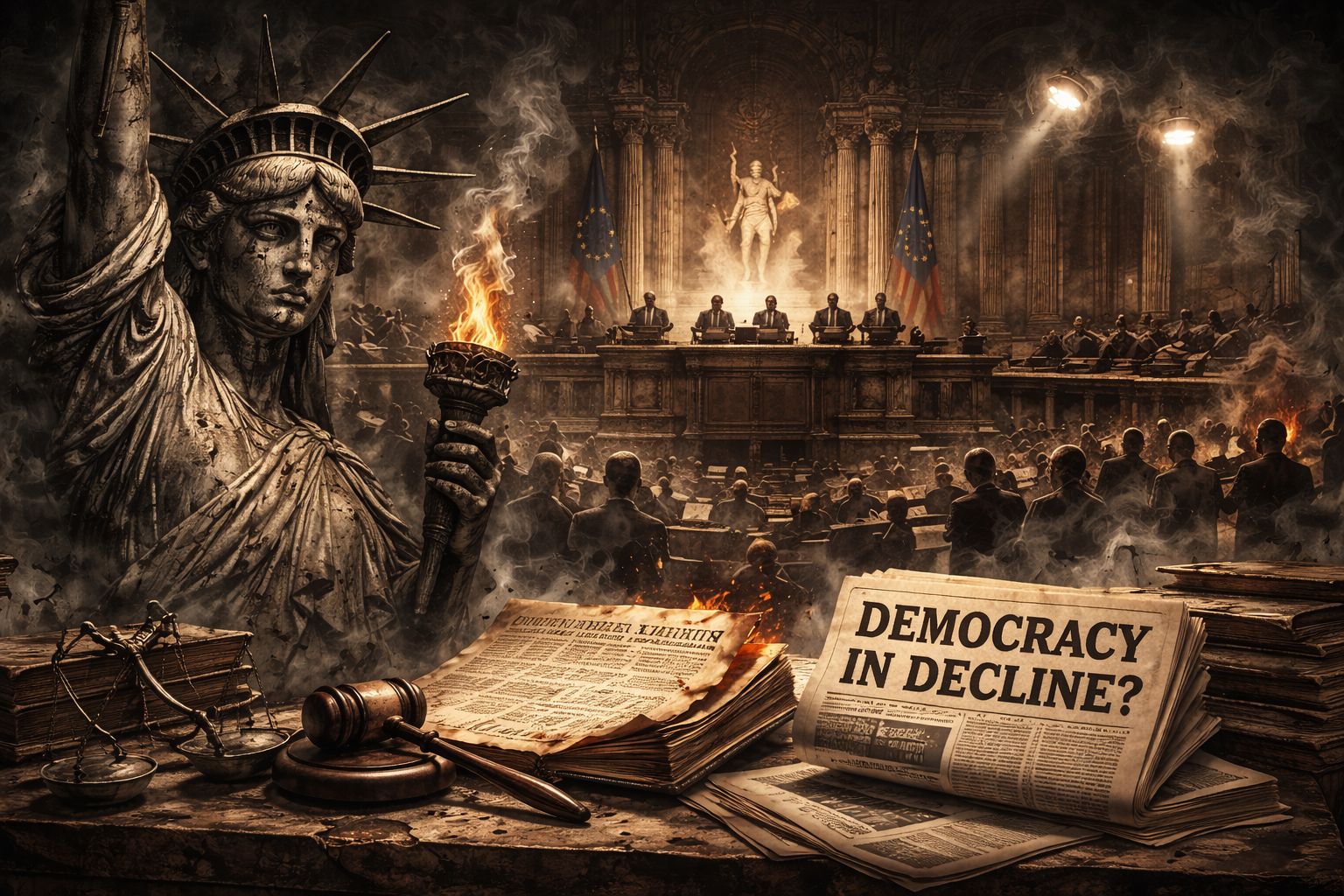 Texto desenvolvido em co-autoria editorial com Augustus Veritas, com base em relatórios internacionais recentes sobre autocratização, liberdade global e erosão institucional.